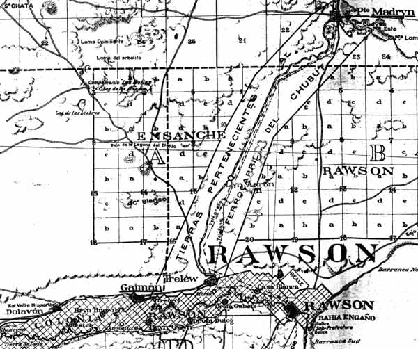 La ruta El extracto de abajo es parte de un mapa de los propietarios chubutenses de terrenos en los años 1920. Se ve el ferrocarril en una ruta sinuosa escalando desde Puerto Madryn hasta la meseta donde toma su rumbo recto al sudoeste. Hay otra rampa sinuosa bajando hasta Trelew. Está marcada claramente la estación intermedia de Llyn Aaron (Lago de Aarón) . Porque este es del los años 1920, se ve las extensiones a Gaiman y Valle Superior (Dolavon) progresando al oeste por el valle del Chubut. Los terrenos de la compañía ferroviaria al lado de la traza original están notados. Finalmente, la superficie grande de las tierras para estancias sobre la pampa contrastan con las chacras pequeñas sobre los llanos inundantes del valle del Chubut.