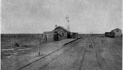 La estación Senillosa, 2 de enero de 1914. La estación parece ser en el medio del desierto sin ninguno otro edificio a la vista. Note como el balasto de tierra cubre los durmientes.