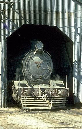 Locomotora pacífico de trocha ancha, la Nº 355, descansa en el galpón en Comodoro Rivadavia en 1975, esperando su lenta corrida semanal a Colonia Sarmiento.
