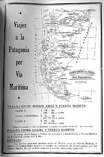 Uno anuncio de la revista Argentina Austral muestra las tres líneas de trocha ancha y el FCCC con su servicio de autobús a Esquel. El anuncio está fomentando viajes por mar para pasajeros entre la Patagonia y la Capital Federal.
