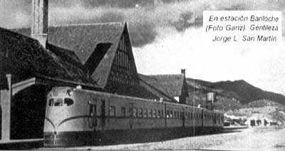 Uno de los trenes de tres coches motores Ganz tipo TB está en la estación Bariloche cerca de 1938.
