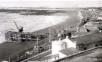 La foto arriba muestra el puente giratorio descansándose aislado en 1992 (3). Era la intención preservarlo. No se si sobrevivió la construcción de la nueva terminal de ómnibus sobre la ex playa ferroviaria. Junto a la estación está el muelle de 1928 y el puerto. Se trata de las obras del Capítulo 7. Últimamente el puerto tuvo sus propias máquinas, como se indica en la página siguiente. Había también vías de trocha 75cm entre los talleres en Km 5 hasta Punta Piedras al sur. En esta vista tomada en febrero de 1943, la grúa gigante Titán descarga vagones de trocha ancha desde un barco. Grúas rodantes a vapor más chicas y una locomotora portuaria se ven detrás. Las vías de trocha económica son visibles también. A la distancia Cerro Chenque está sobre la ciudad.
