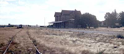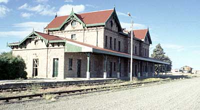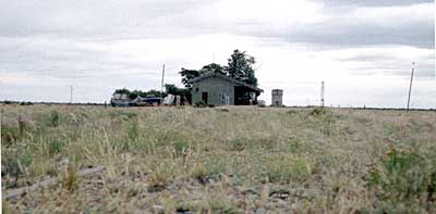 La vista de un pasajero en el autobús que viaja hacia el este a Puerto Deseado. A la izquierda una torre para agua y el edifico abandonado de la estación. Creo que es Antonio de Biedma o Pampa Alta.