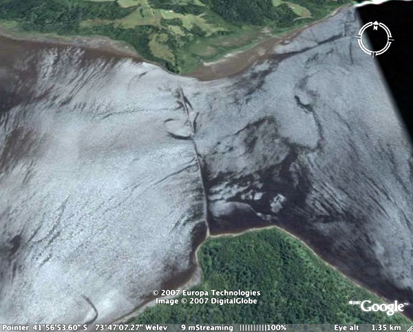Esta foto de Google Earth muestra el sitio del antiguo puente San Antonio. La ruta llega desde Ancud al lado del litoral a la derecha arriba del mapa hasta el centro arriba, pues tenía rumbo hacia el sur sobre un terraplén bajo hasta el puente, posiblemente de unos 50 m de longitud sobre un río de aguas mansas con régimen de marea y continuaba sobre terraplén similar hasta la zona boscosa abajo donde se cambió rumbo hacia el sudoeste. El total de los 1.200 m de terraplén y puente están ahora bajo el agua y visible como sendero bajo el agua.