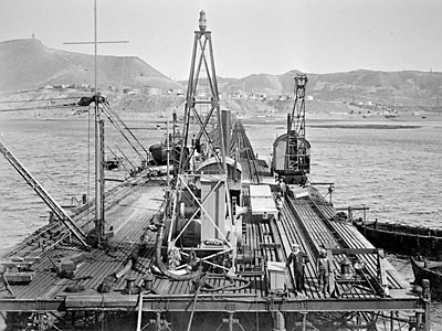 Una segunda foto, como la de arribe, descubierta en el Archivo General de la Nación en Buenos Aires, muestra las dos líneas de trocha angosta sobre el muelle. En este punto están pasando una grúa a vapor de trocha ancha montada sobre una plataforma más alta aislada de los otros rieles.