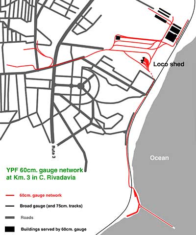El mapa provisorio debajo muestra (5) que se dirigía desde los talleres principales YPF al sur al Muelle YPF. El mapa representa quatro kilómetros entre la parte inferior y la superior. Los mapas topográficos de los años 1950, que fueron descubiertos más recién, muestran una red mucha más grande, extendiendo al norte y al oeste hasta 5km. Vea debajo para el acceso a estos mapas.
