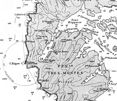 Debajo está parte de la carta náutica del Almirantazgo británico Nº 1287 de 1964. Se ve claramente el faro así como la ruta desde el Seno Hoppner en el nordeste. Se ven las líneas de isonivel de 1.000 pies y 2.000 pies (305 y 610 metros) pero es claro en cartas chilenas más modernas que si se toma un rumbo al sudeste a la costa pacífica por la anchura mínima el istmo es más bajo.