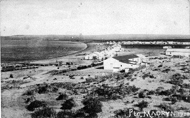 El Señor Héctor Guerreiro proveyó bondadosamente esta vista antigua, tomada antes de la construcción de los nuevos edificios de la estación y de la Compañía Mercantil del Chubut. El fotógrafo esta sobre la tierra elevada cerca la casa del gerente. En primer plano está el galpón para las máquinas, con coches y una máquina rodeando la mesa giratoria.
