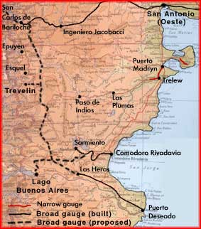 "Lo temprano como 1908, el gobierno decidió construir unos ferrocarriles de fomento en los territorios nacionales. Esos contenían tres líneas de trocha ancha, desde los puertos atlánticos a zonas coloniales en el interior, con enlaces entre los mismos, para hacer una red integral. El más boreal hubiese tenido rumbo desde el puerto de San Antonio a San Carlos de Bariloche, al lado del Lago Nahuel Huapí, con un ramal a Colonia 16 de Octubre (después conocido como Trevelin) al sur de Esquel. Más austral, líneas eran las de Comodoro Rivadavia (un puerto naval importante) y Puerto Deseado al oeste hacia Lago Buenos Aires, desde lo que norte a Colonia 16 de Octubre.