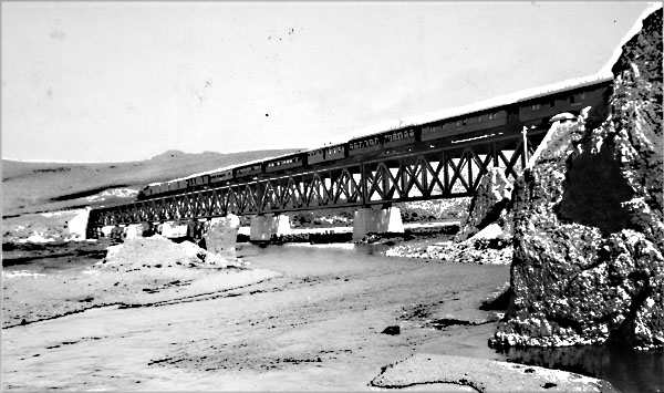 El puente Pichileufú, unos 50 km fuera de Bariloche. El coche sobre el pilar a la derecha es un coche dormitorio del FC Sud de tipo R7 con boguies de seis ruedas. Unas 18 unidades fueron construidos en 1922/23 (6).