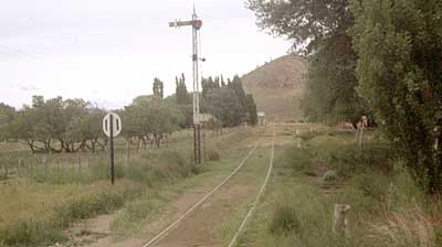 Empalme 648 (desde Viedma) donde la trocha angosta de La Trochita sale rumbo a Esquel. Se puso en desuso el señal de estilo muy inglés en el medio de la década 90, pero el brazo sobreviviente ya tiene su cruz indicando que está fuera de servicio.
