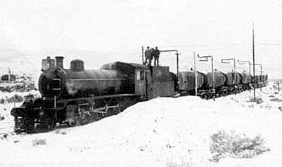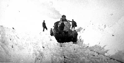 Los visitantes en verano, que ven como son las pampas ventosas, calientes y áridas en la Patagonia, raramente imaginarían que la cosa mejoraría en época invernal. Estas dos fotografías muestran contra qué tenía que luchar el ferrocarril. La ilustración de arriba, tomada en los años 1930, muestra una pacífico sobre una sección de vía donde se despejó nieve. La de abajo, de los años 1950 o 60 indica una situación muy diferente. Las dos están cerca de Pampa del Castillo. Note el faro grande a querosén en la primera, y el eléctrico en la segunda.