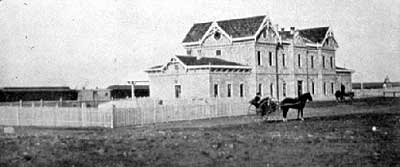 El lado de la plataforma del edificio de la estación Puerto Deseado en 1936, con una porción de la plataforma encerrada, posiblemente para uso como restaurante.