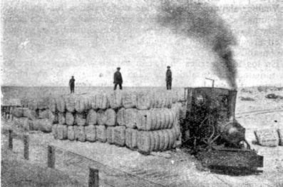 Las fotografías, arriba y abajo, muestran una máquina (probablemente la Hanomag Nº 4567 mostrada abajo) y los bultos grandes de lana que eran la carga principal de la estancia al puerto. La de arriba fue tomada en la estancia fuera el almacén de lana que está hoy, pero frente a la Ruta Nacional. Agradezco al Licenciado Carlos Pedro Vairo del Museo Marítimo de Ushuaia por la fotografía.