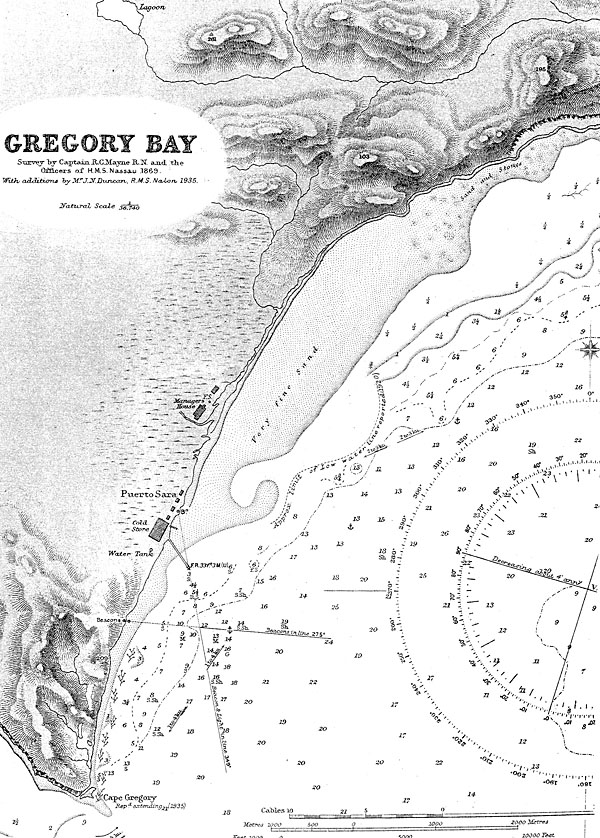 La carta náutica del Almirantazgo Británico de 1935 muestra la cámara fría y el muelle de Puerto Sara, pero es probable que los rasgos a tierra hayan sido renovados erráticamente desde la medición original de la carta en 1869.