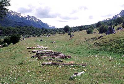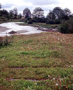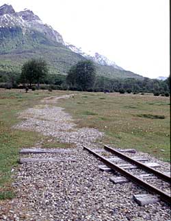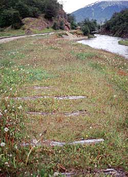 La estación principal del FCAF (Ferrocarril Austral Fueguino) mira hacia el norte. El tren parte hacia el parque describiendo una curva a la izquierda para tomar la antigua traza del ferrocarril penitenciario. Esta vista, mirando al este, demuestra porqué la traza original no podía ser usada nuevamente. El fotógrafo estuvo parado casi sobre los rieles nuevos (con permiso). Los durmientes viejos son visibles por unos metros, más lejos, el río ha destruido cincuenta metros o más del terraplén viejo. La traza pasaba antiguamente justo por los brazos más grandes del río. Doblando suavemente a la izquierda el rastro de las vías sobrevive después de los arbustos verde oscuro al lado del río. Un puente grande ha sido destruido y el terraplén al otro lado del río desaparece a lo lejos detrás de un poste de madera.