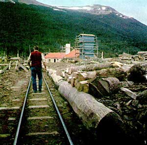 Los bosques y los aserraderos El lado occidental (chileno) de Tierra del Fuego, y partes vecinas del continente, eran cubiertos de bosques inmensos cuando llegaban los europeos. Esos eran las primeras fuentes de riqueza natural que eran explotadas desde los años 1840. Cortaban primeramente la región del Península Brunswick alrededor de Punta Arenas. Como crecía la industria, más grandes aserraderos fueron construidos, primeramente usando la fuerza hidráulica, y desde 1875 usando el poder del vapor. (4) Desde los años 1890, los aserraderos estaban más lejos, hasta unas de las islas. Pero la región de la importancia más grande en los años 1920 a 1940 era la costa oeste de Isla Grande. Aquí estaban los aserraderos grandes de La Pacencia, Puerto Arturo y Puerto Yartou de la empresa Sociedad Anónima Ganadero, la empresa combinada Menéndez-Behety y Alberto Baeriswyl. En los años 1930 el escrito del Señor Mateo Martinic indica que estaban veintidós aserraderos grandes en Magallanes con 2.000 empleados. Pero eso tiempo era la cima, y los problemas económicos, causadas parcialmente por las restricciones de la importación de la madera a la Argentina, se dirigieron a una declinación lenta. Estaba un aserradero en el frigorífico de Puerto Bories en Última Esperanza. Tenía conexión con el ferrocarril del frigorífico descrito e ilustrado en Capítulo 8; el segundo muelle estaba al frente del aserradero. El ejemplo del ferrocarril prisionero forestal de Ushuaia sugiere que es posible que se usaran vías férreas en otras partes. La única evidencia hasta hoy es el recuerdo del Señor Sergio Zagier de viendo carriles en el aserradero abandonado en Puerto Arturo. La fotografía debajo muestra un convoy de vagones en el aserradero Puerto Yartou. Son unidos en una manera que probablemente necesitó el uso de una máquina para hacerlos marchar. El aserradero al lado este de la Isla Dawson, explotado por los padres Salesianos, tenía por cierto un ferrocarril de trocha 60cm hasta el muelle cercano (2). La carta náutica Nº 3610 de 1906 del Almirantazgo británico indica el muelle y las vías ferroviarias, que son confirmados por una fotografía de 1903 en la colección de la Royal Geographical Society (la asociación real de geografía) Londres. Es posible que esta línea extendiera por la colina hasta los bosques, pero no es cierto. Los aserraderos en Tolhuin tienen rieles viejos usados en tareas varias. Las tres fotos que siguen, aunque de calidad inferior, muestran el viaducto largo con una vía férrea desde el aserradero de Isla Dawson hasta el muelle. Todas fueron tomadas desde el mismo punto al nordeste de la bahía abierta al sueste.