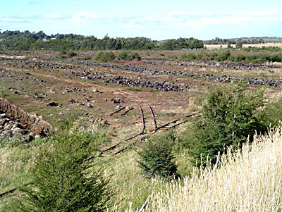 Turberas en Isla de los Estados Un ferrocarril en una turbera La primera ilustración muestra la vía al lado de la turbera bajo explotación y un ramal hacia el centro. Los rieles son fabricados en secciones e importados desde Suecia. La trocha es de 60cm.